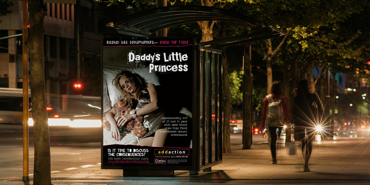 One of our finished posters included the tagline ‘Daddy’s Little Princess’ and depicted a young girl shown to be drunk and vulnerable. The male version had a similar image and used the strapline ‘Mummy’s Boy’.
