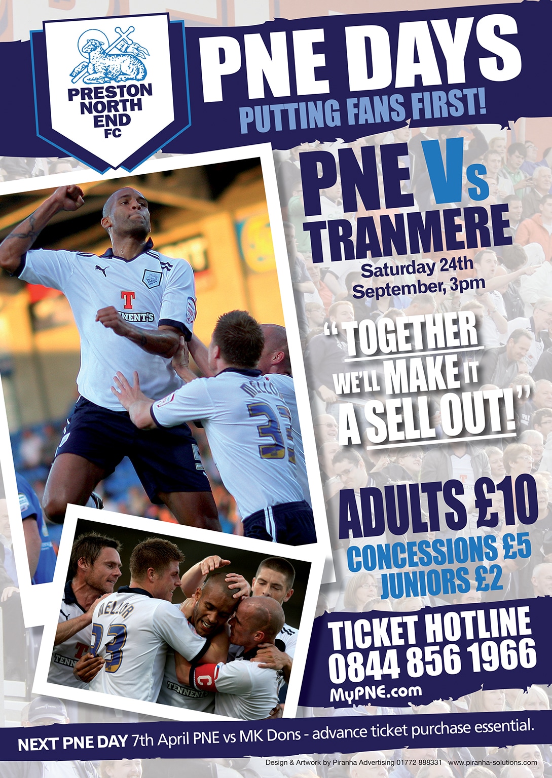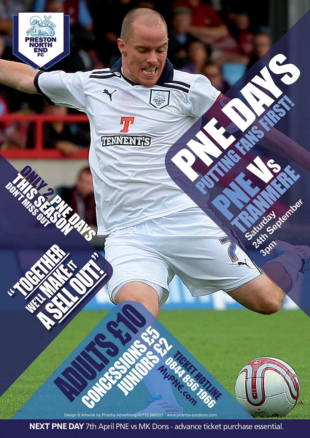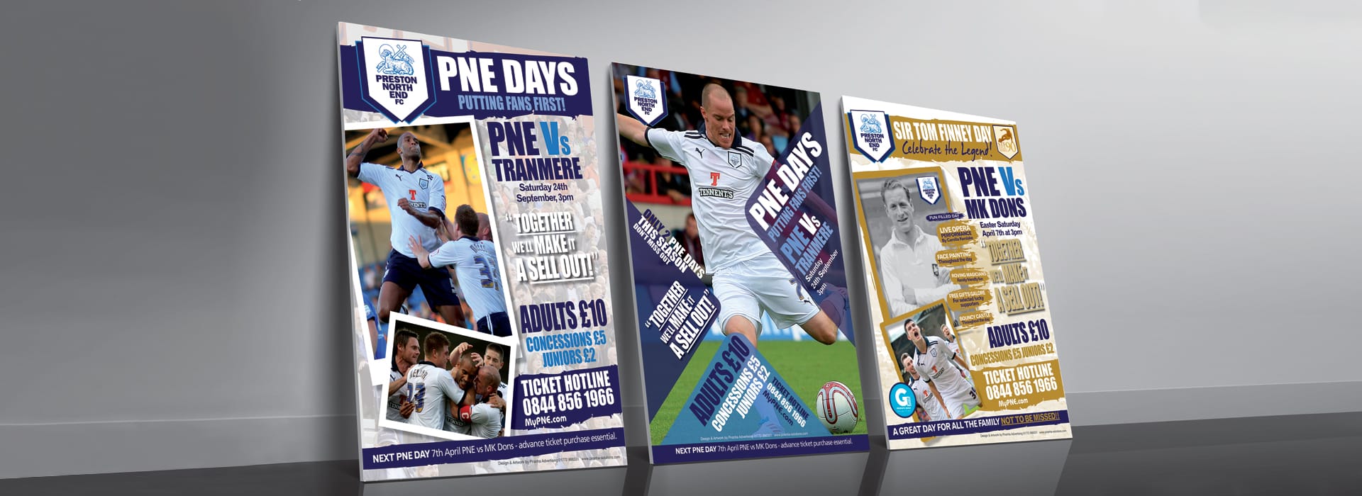 Piranha’s designers created an illustrated version of the iconic photograph of Sir Tom ‘The Splash’ and incorporated this custom gold logo into posters for the event. The Piranha team also produced a series of promotional posters for various fixtures, created in line with Preston North End’s brand guidelines.